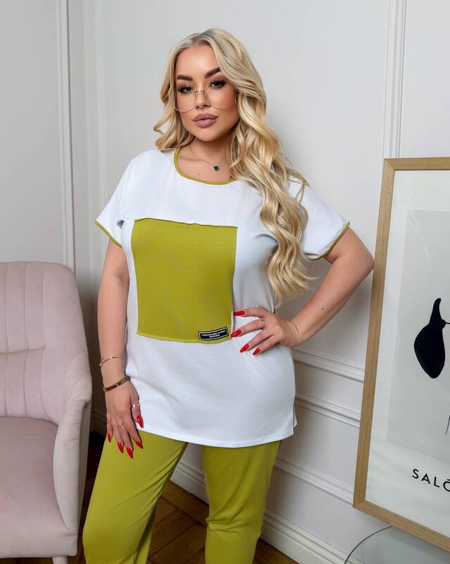 Верх выполнен в виде свободной футболки с коротким рукавом и круглым вырезом. Посадка удобная, не обтягивает фигуру, мягко ложится по линии груди и бедер, помогает чувствовать себя свободно и уверенно. Контрастная декоративная вставка на передней части делает футболку более выразительной, добавляет стильный акцент и визуально освежает простой базовый фасон.