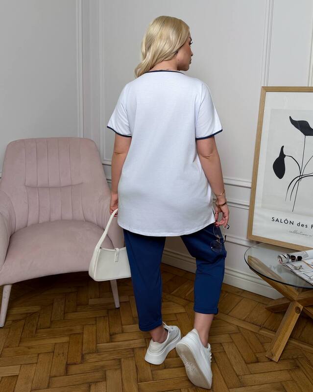 Верх выполнен в виде свободной футболки с коротким рукавом и круглым вырезом. Посадка комфортная, не обтягивает фигуру, мягко ложится по линии груди и бедер, помогает чувствовать себя уверенно и свободно в течение дня. Контрастная декоративная вставка на передней части добавляет стильный акцент, делает футболку более выразительной и визуально освежает базовый фасон.