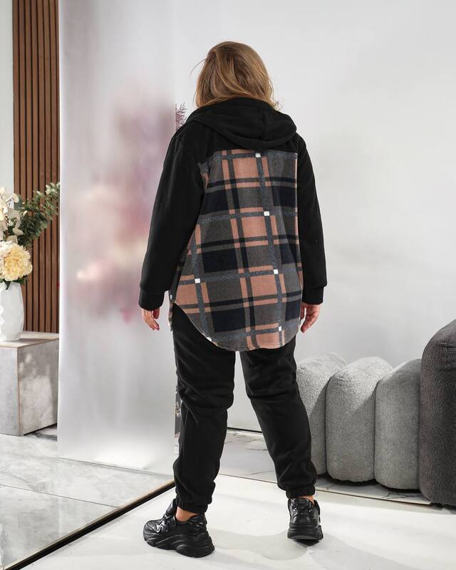 Верх костюма выполнен в удлинённом фасоне с застёжкой на молнию и удобным капюшоном, который при необходимости защищает голову от холода и ветра. Передняя часть оформлена стильной вставкой в крупную клетку и украшена контрастной надписью “NEW YORK BRONX”, что придаёт образу современный городской характер. Благодаря свободному крою и мягким манжетам по рукавам и низу, кофта обеспечивает комфортную посадку и свободу движений. Практичные боковые карманы делают изделие ещё удобнее в повседневной носке.