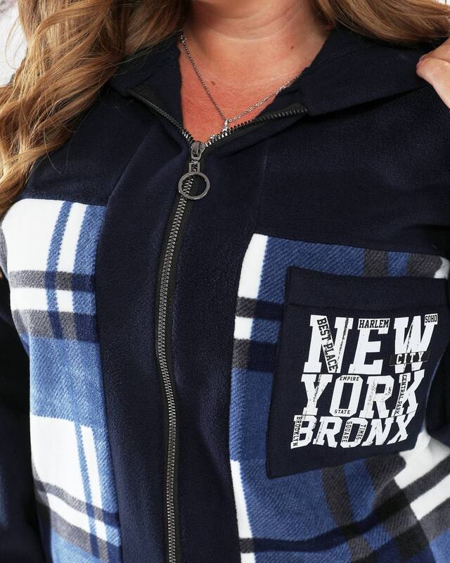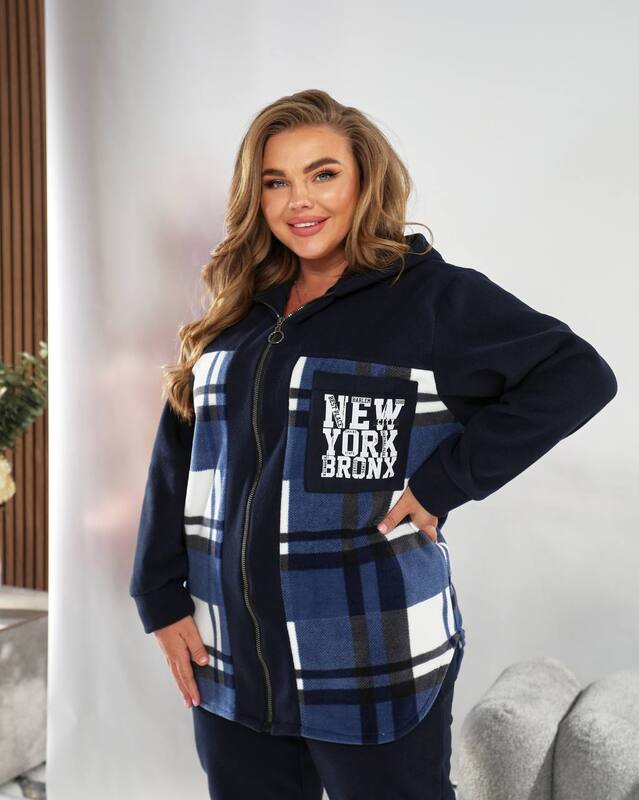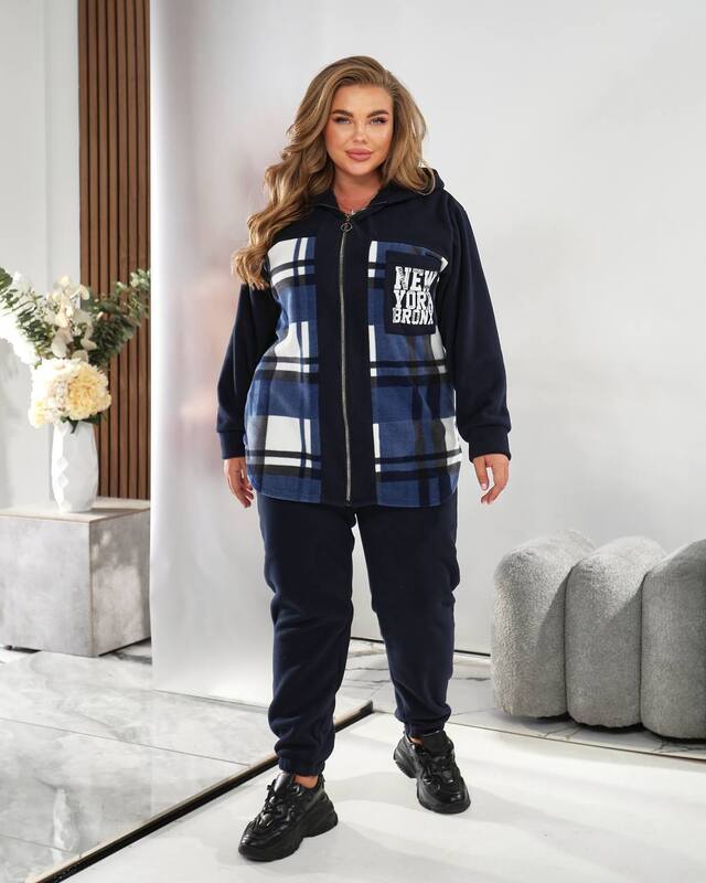Верх костюма выполнен в удлинённом крое с застёжкой на молнию и удобным капюшоном, который надёжно защищает от ветра и делает образ более спортивным. Стильная клетчатая вставка на передней части в сочетании с однотонными рукавами и спинкой придаёт костюму оригинальность и визуально стройнит фигуру. Контрастный принт “NEW YORK BRONX” добавляет динамики и делает образ актуальным и городским. Мягкие манжеты на рукавах и по низу обеспечивают комфортную посадку, а боковые карманы добавляют практичности и уюта.