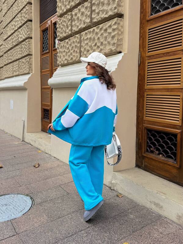 Голубой оттенок в сочетании с белыми вставками придаёт комплекту свежесть и лёгкость, делая его отличным выбором для прогулок, путешествий и активного отдыха. Этот костюм подойдёт женщинам, которые ценят комфорт, тепло и современный стиль, и станет незаменимой вещью в гардеробе на осенне-зимний период.