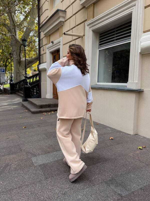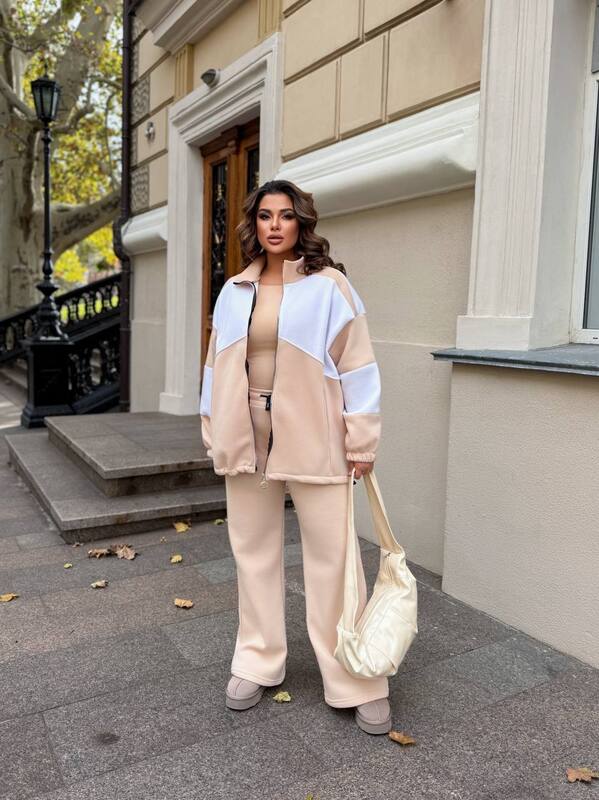 Нежный бежевый оттенок с белыми вставками делает комплект универсальным, свежим и женственным. Он гармонично сочетается с обувью любого типа — от кроссовок до угг, создавая современный и ухоженный образ. Этот костюм объединяет в себе уют, функциональность и трендовый стиль, подчёркивая женственность даже в повседневных нарядах.