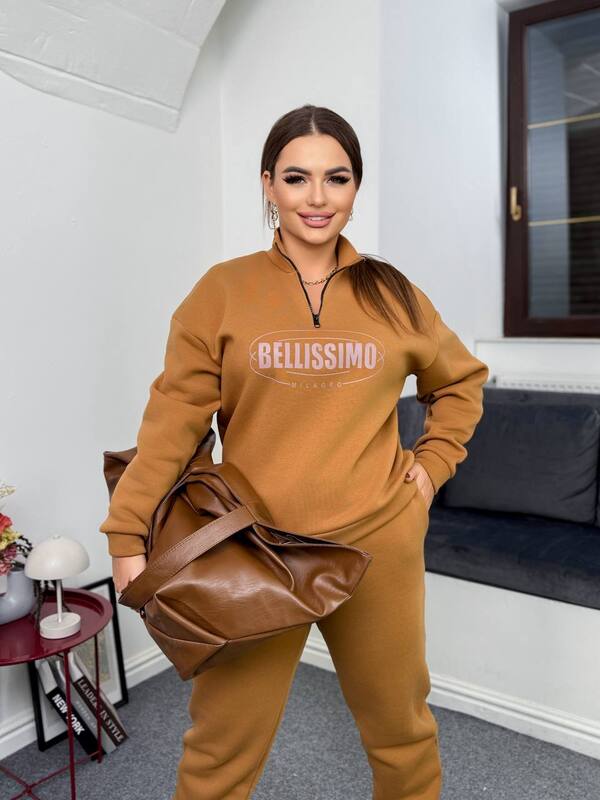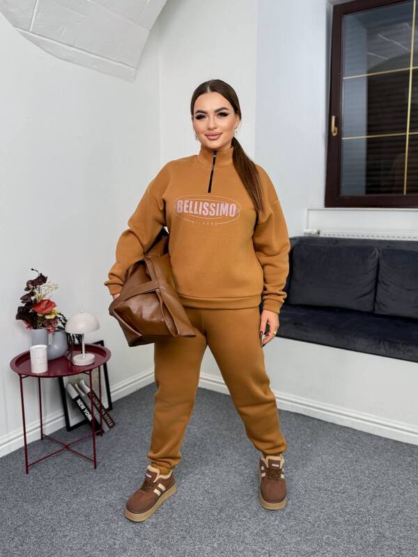 Верх костюма представлен свободным свитшотом в стиле oversize с воротником на короткой молнии, который придаёт образу современный и динамичный акцент. Дизайн дополнен стильным принтом “BELLISSIMO Milano”, подчёркивающим модный городской характер модели. Свитшот имеет мягкие манжеты на рукавах и по низу, что обеспечивает удобную посадку и удерживает тепло. Oversize-крой делает изделие универсальным и комфортным для женщин любого типа фигуры, а лаконичные линии и продуманные детали делают образ гармоничным и элегантным.