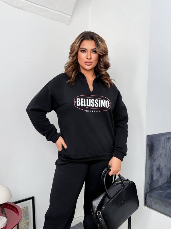 Верх костюма — свободный свитшот oversize с мягким капюшоном и стильным принтом на груди. Современный дизайн с акцентом на надпись придаёт образу динамичность и лёгкость, а свободный крой позволяет чувствовать себя максимально комфортно. Манжеты на рукавах и по низу изделия обеспечивают удобную посадку и защищают от холода. Свитшот идеально садится по фигуре, не сковывает движений и подходит для любого типа телосложения.