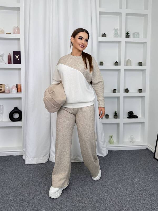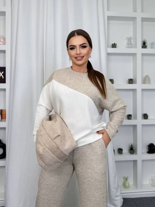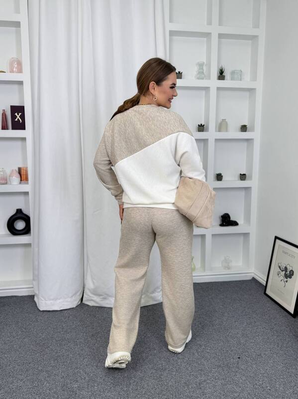 Верх комплекта — мягкий джемпер свободного кроя с округлым вырезом горловины и манжетами на рукавах. Элегантный контрастный дизайн с диагональными вставками визуально корректирует фигуру и добавляет динамичности образу. Такой фасон подходит для любого типа фигуры, мягко подчёркивая силуэт и при этом скрывая возможные несовершенства. Ткань красиво ложится, создавая ощущение лёгкости и уюта при каждом движении.