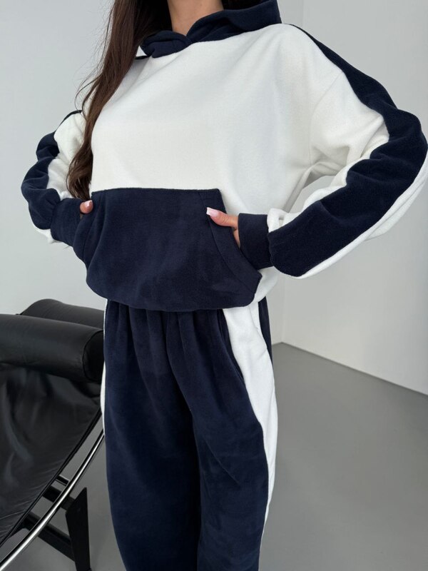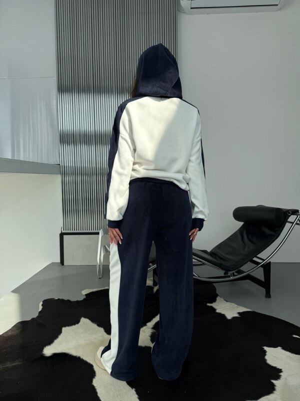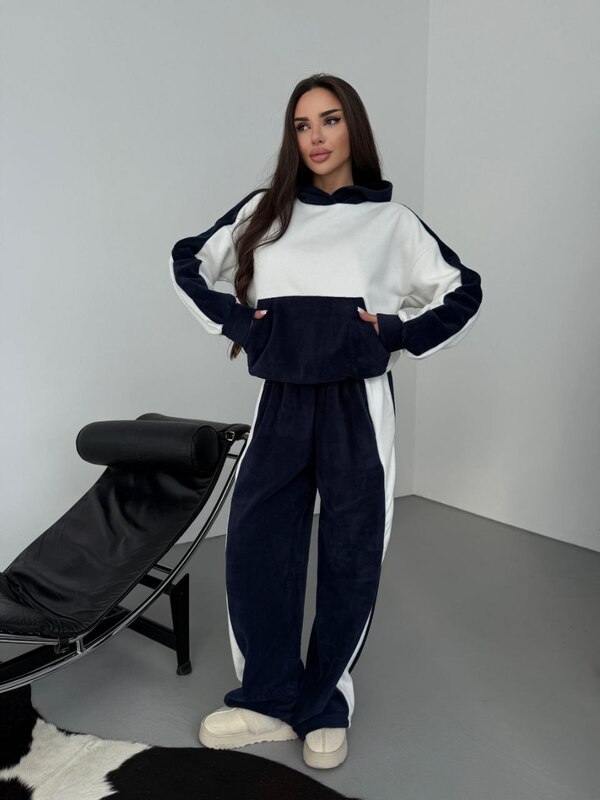 Кофта свободного кроя с капюшоном и большим карманом-кенгуру обеспечивает комфорт и практичность, создавая стильный расслабленный образ. Контрастное сочетание цветов придаёт комплекту современный вид и визуально вытягивает силуэт. Брюки фасона палаццо с двумя функциональными карманами и мягким поясом на резинке обеспечивают удобную посадку и свободу движений, при этом визуально удлиняют ноги.
