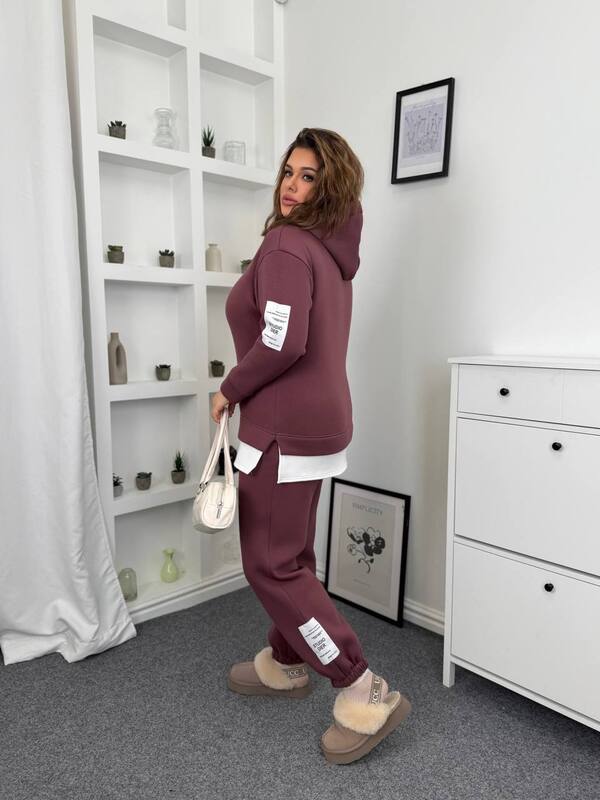 Глубокий сливовый оттенок придает костюму утонченности и женственности, а продуманный крой подчеркивает фигуру и обеспечивает свободу движений. Костюм идеально подходит для прогулок, путешествий, активного отдыха или домашнего уюта, сочетая в себе стиль, тепло и комфорт.