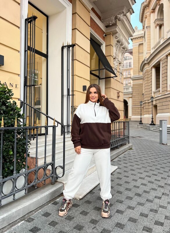 Кофта свободного кроя выполнена с высоким воротником-стойкой на молнии, что придает модели спортивную динамичность и защищает шею от холода. Контрастное сочетание оттенков добавляет образу стиля и делает костюм выразительным. Брюки — джоггеры с эластичным поясом и манжетами по низу, имеют два удобных кармана и обеспечивают комфортную посадку по фигуре.