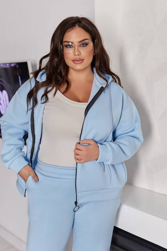 Кофта имеет свободный крой, застегивается на удобную молнию и дополнена объемным капюшоном, который защищает от ветра. Большие накладные карманы придают изделию практичность и уютный характер. Брюки с манжетами по низу и эластичным поясом создают комфортную посадку, подчеркивая женственность силуэта.
