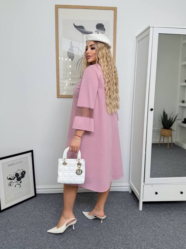 Декоративные вставки из сетки на груди и рукавах придают модели особое очарование и изысканность. Они создают лёгкий контраст с основной тканью и добавляют нотку романтичности. Широкие рукава с манжетами формируют мягкий объём, а круглый вырез красиво подчёркивает линию шеи. Эти акценты делают платье не просто базовым, а по-настоящему стильным элементом гардероба.