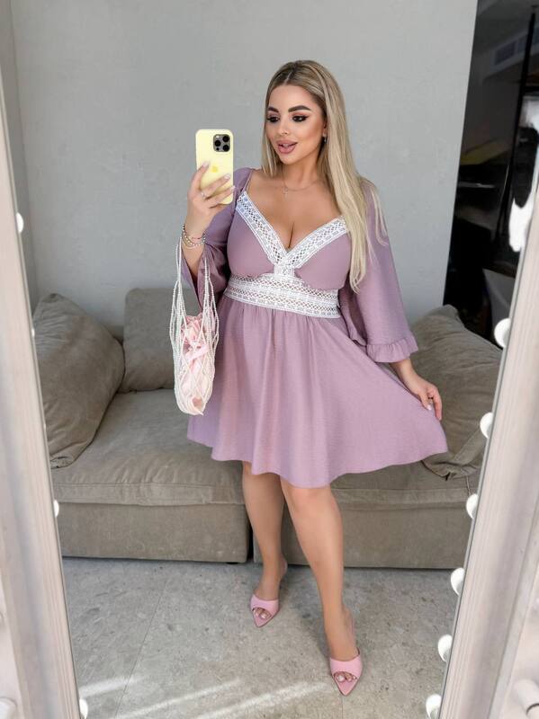 Отзывы о Платье-трапеция женское из льна-жатки с кружевной отделкой и расклешенными рукавами больших размеров весенне-летнее k-129397