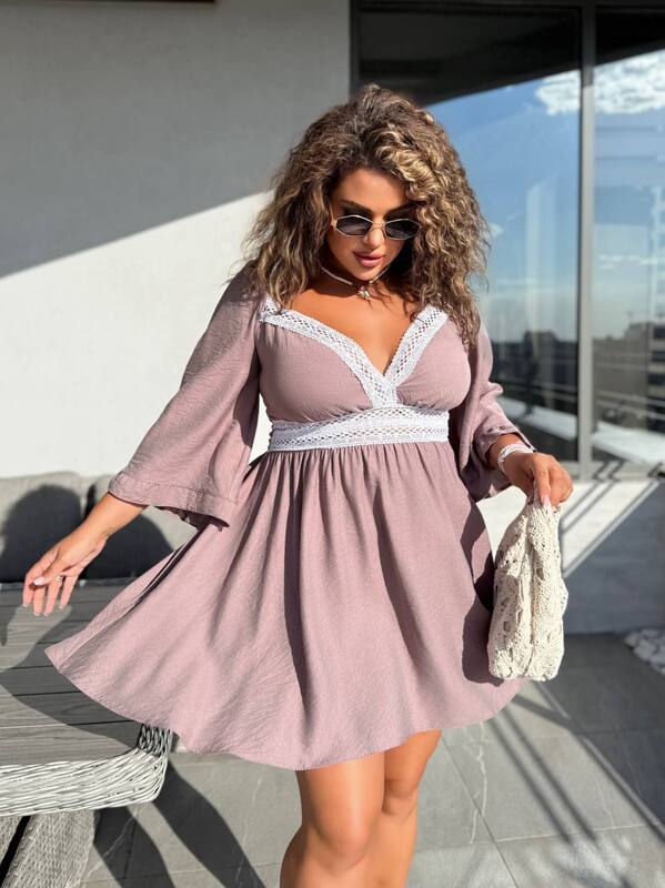 Верх платья оформлен глубоким V-образным вырезом с декоративной кружевной отделкой. Такой акцент красиво подчеркивает зону декольте, визуально удлиняет шею и делает силуэт более изящным. Отделка под грудью дополнительно выделяет верхнюю часть, помогает сформировать женственную линию посадки и добавляет изделию нарядности.
