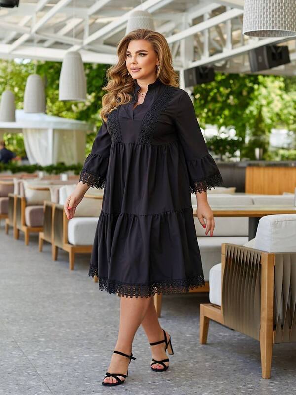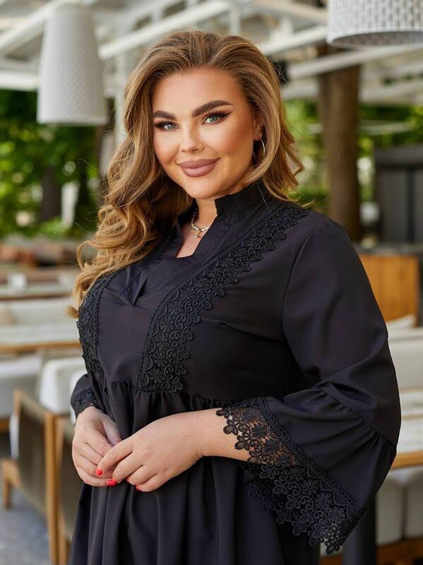 Отзывы о Платье-трапеция женское из софта с кружевной отделкой и длинными рукавами больших размеров весенне-летнее k-129392