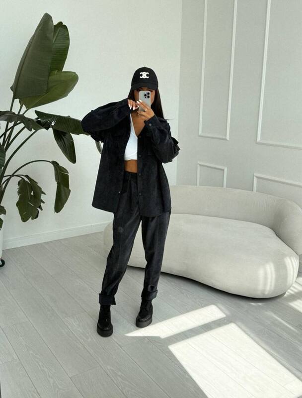 Женский костюм-двойка из вельвета сочетает в себе практичность и модный акцент на фактуру ткани. Комплект состоит из свободной рубашки с воланами и брюк прямого кроя, которые фиксируются внизу стильными заклепками, создавая аккуратный силуэт и позволяя регулировать посадку. Вельвет дарит не только мягкость и уют, но и выразительный внешний вид, подчеркивающий трендовость модели.