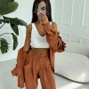 Костюм-двойка женский из вельвета с рубашкой на воланах и брюками с заклепками осенний k-123292