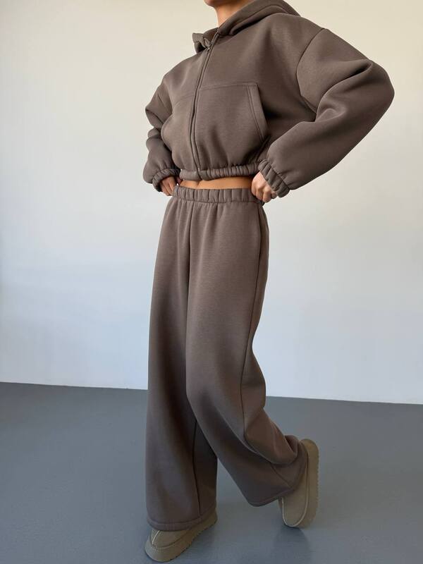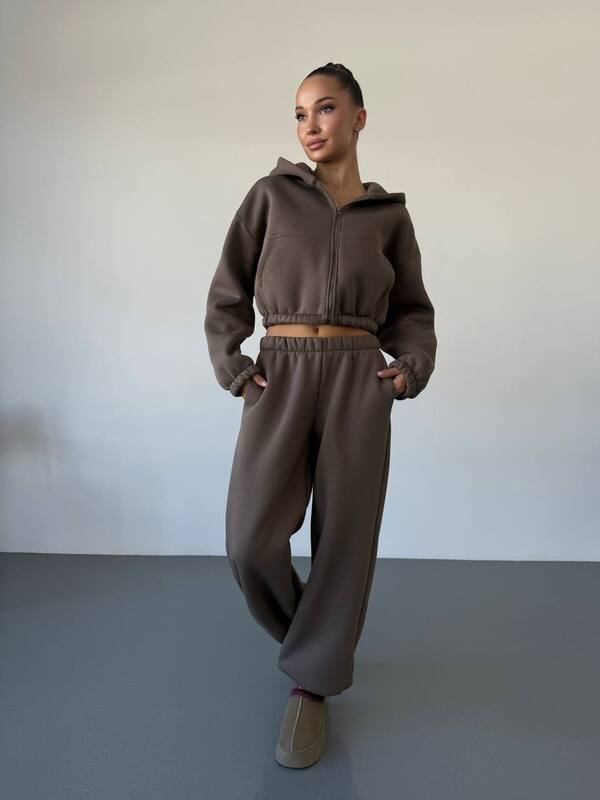 Брюки прямого кроя с регулируемым низом идеально дополняют верх. Посадка на талии комфортная, с мягкой резинкой, обеспечивающей отличную фиксацию и удобство в движении. Свободные штанины визуально вытягивают силуэт, создавая эффект лёгкости и непринуждённости. Тёплая внутренняя подкладка с флисом дарит уют даже в самую прохладную погоду, а регулируемый низ позволяет носить модель как с ботинками, так и с кроссовками. Это делает костюм универсальным выбором для любого случая.