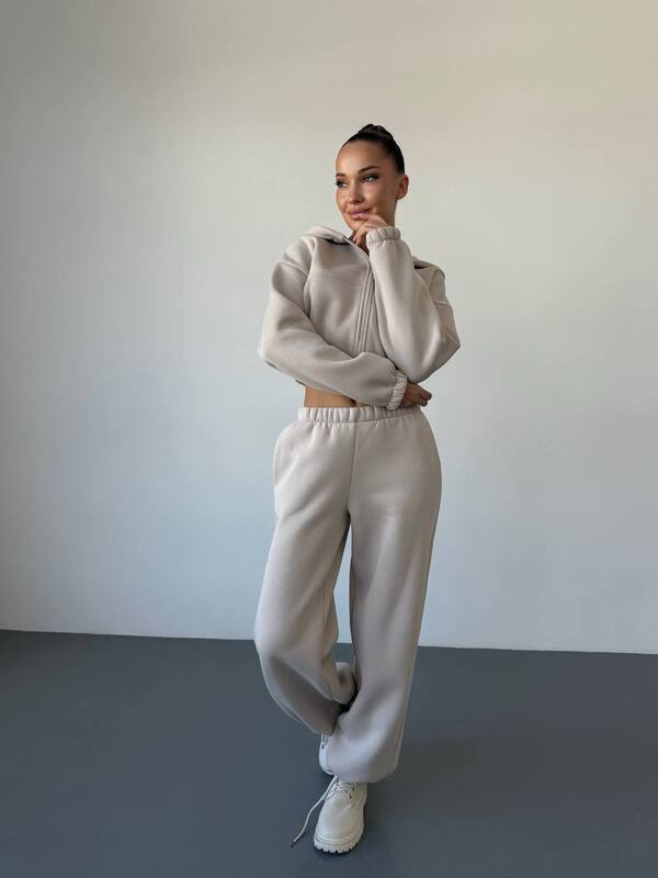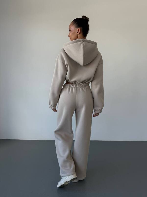Кофта выполнена в укороченном дизайне с аккуратным воротником-стойкой и молнией по центру. Благодаря свободному крою и эластичной резинке по низу, изделие красиво подчёркивает линию талии, создавая женственный и современный силуэт. Манжеты на рукавах сохраняют тепло и делают образ аккуратным, а двойной капюшон добавляет дополнительную защиту от ветра и придаёт спортивный стиль. Такая кофта отлично комбинируется как с брюками из комплекта, так и с другими элементами гардероба.
