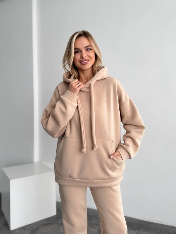 Худи с капюшоном и объёмным карманом-кенгуру выполнено в свободном фасоне oversize, создающем расслабленный, но стильный образ. Брюки с завышенной талией и эластичными манжетами подчёркивают фигуру и обеспечивают удобную посадку. Классический бежевый цвет делает костюм универсальным для повседневных прогулок, поездок и отдыха.
