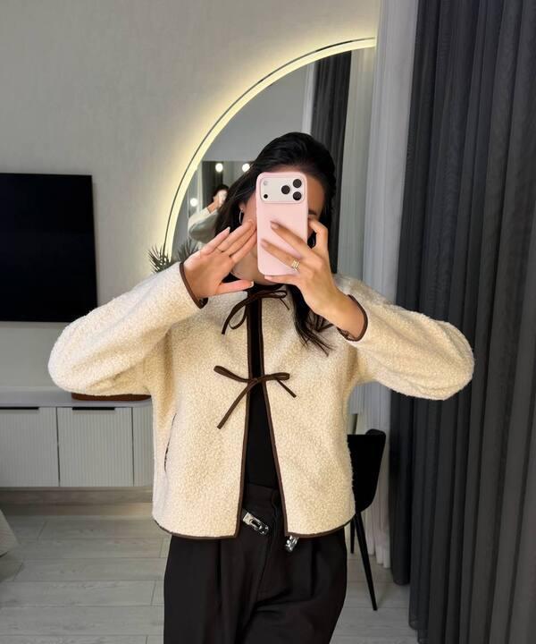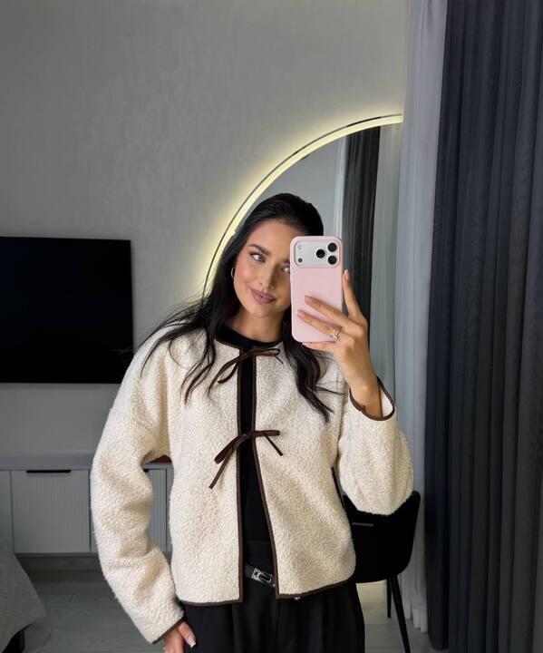 Бомбер из ткани барашек букле — это стильная и уютная модель, которая сразу привлекает внимание мягкой фактурой, аккуратным кроем и современным внешним видом. Такая вещь отлично подходит для весеннего гардероба, когда особенно хочется добавить в образ комфорт, легкость и визуально дорогую фактуру. Модель выглядит актуально, аккуратно и очень женственно, поэтому легко вписывается как в повседневные городские образы, так и в более собранные стильные сочетания на каждый день.
