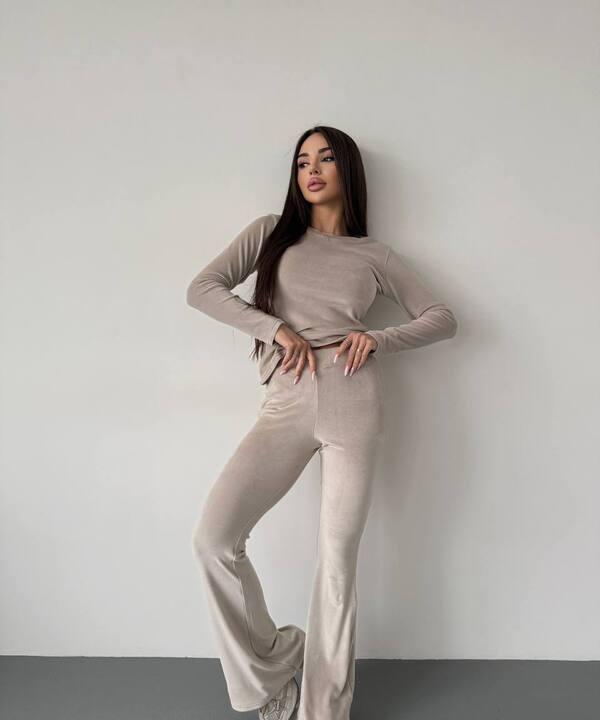 Отдельное преимущество модели — велюр. Эта ткань очень приятная к телу, мягкая, бархатистая и комфортная в носке. Она красиво смотрится, делает комплект визуально более дорогим и придаёт образу уютную, привлекательную фактуру. Велюр хорошо подходит для тех вещей, в которых хочется чувствовать себя свободно, комфортно и уверенно. Такой материал добавляет комплекту мягкости, а образу — более женственное и аккуратное настроение.