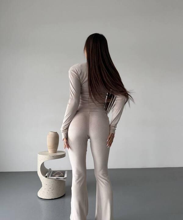 Брюки в этом комплекте выглядят особенно эффектно благодаря удлинённому силуэту и лёгкому расклешению к низу. Такой фасон визуально удлиняет ноги, делает фигуру стройнее и придаёт образу плавность и выразительность. Посадка смотрится аккуратно и удобно, а сам костюм в целом производит впечатление стильного, продуманного и гармоничного комплекта, который подходит на каждый день и при этом не выглядит слишком просто.