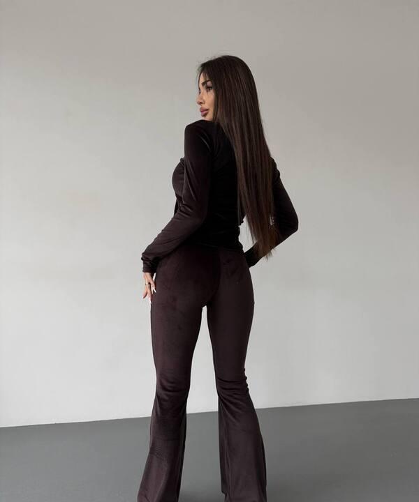 Брюки в этой модели смотрятся особенно эффектно за счёт удлинённого силуэта и лёгкого расклешения к низу. Такой фасон визуально вытягивает фигуру, делает образ более стройным и добавляет движению красивую плавность. Посадка выглядит аккуратно и современно, а сам костюм создаёт впечатление продуманного, стильного и гармоничного комплекта. Это отличный вариант для прогулок, встреч, отдыха и повседневных дел, когда хочется выглядеть не просто удобно, а действительно красиво.