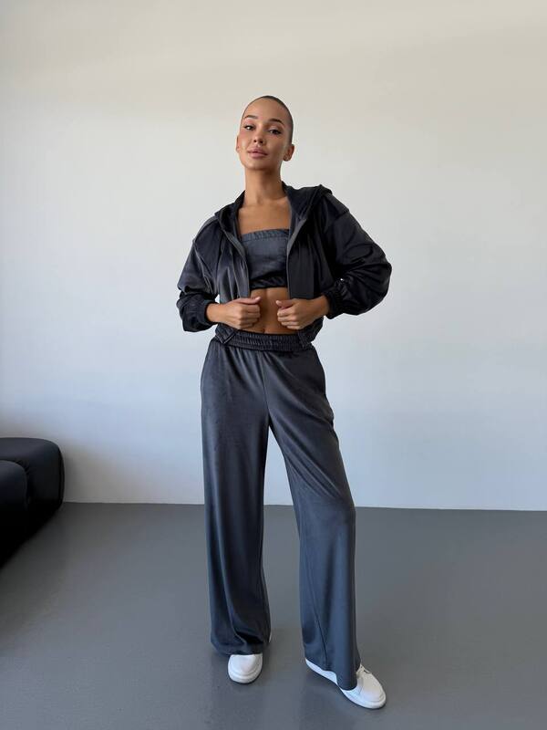 Костюм-тройка женский из трикотажного велюра с укороченным топом, кофточкой с капюшоном и широкими брюками осенний  k-123499