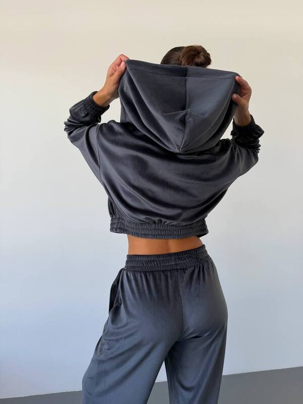 Отзывы о Костюм-тройка женский из трикотажного велюра с укороченным топом, кофточкой с капюшоном и широкими брюками осенний k-123499