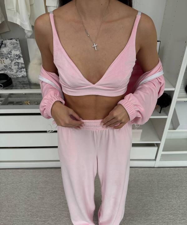 В набор входят кофта на молнии с капюшоном, бра-топ и свободные брюки. Благодаря этому костюм можно носить по-разному, меняя настроение образа. Кофта свободного кроя делает посадку комфортной и непринужденной, не сковывает движения и хорошо подходит для активного дня. Капюшон добавляет модели более расслабленный характер, а молния делает вещь практичной и удобной в носке. Бра-топ подчеркивает современность комплекта и добавляет образу легкость, делая его более трендовым и выразительным.