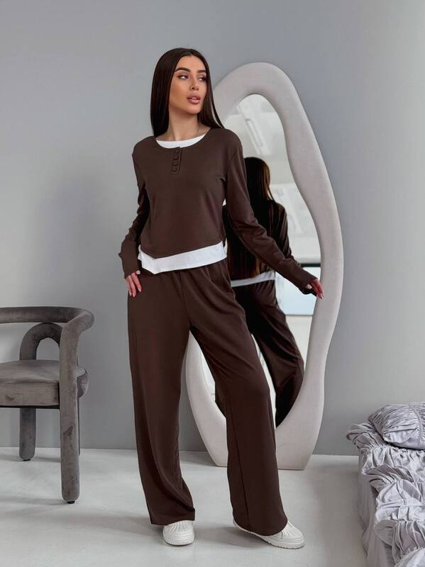 Женский костюм из двунитки — стильное решение для повседневного гардероба, которое сочетает в себе комфорт и универсальность. Комплект включает свободный лонгслив с длинным рукавом и аккуратной планкой на пуговицах, а также широкие брюки на резинке, обеспечивающие удобную посадку.