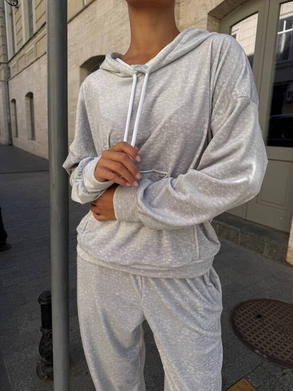 Костюм состоит из двух элементов: худи и брюк. Худи свободного кроя имеет капюшон с завязками, удобный карман-кенгуру и длину по спинке 65 см, что делает его практичным и функциональным. Брюки длиной по внешнему шву 100–101 см выполнены с эластичным поясом и манжетами по низу, что гарантирует удобную посадку и свободу движений. Свободный силуэт костюма позволяет чувствовать себя комфортно в течение всего дня.