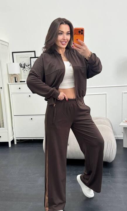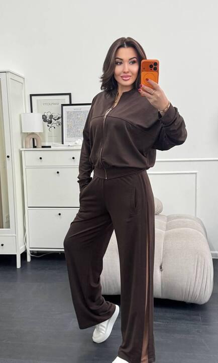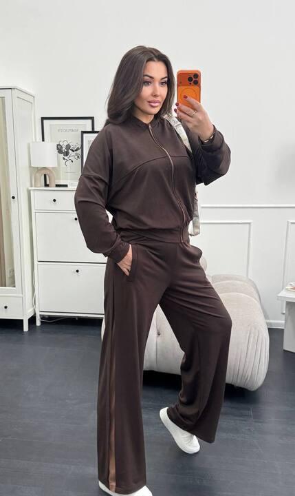 Брюки в этом костюме выполнены в широком свободном крое, поэтому красиво ниспадают по фигуре и создают ощущение лёгкости в движении. Лампасы по бокам становятся выразительной деталью и визуально вытягивают силуэт, благодаря чему ноги кажутся длиннее, а образ — более стройным и эффектным. Такой фасон особенно удачен для тех, кто любит сочетание комфорта и модного внешнего вида. Брюки не сковывают движения, хорошо подходят для активной повседневной носки и смотрятся современно как с кроссовками, так и с другой удобной обувью.