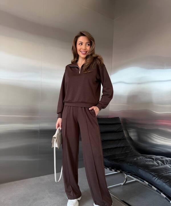 Брюки свободного кроя гармонично дополняют верх и создают расслабленный, но при этом аккуратный силуэт. Такая посадка делает костюм особенно комфортным для повседневной носки, прогулок и поездок. Брюки красиво смотрятся в движении, не перегружают образ и помогают создать современный, непринужденный и при этом очень собранный внешний вид. Комплект выглядит цельно и гармонично, поэтому не требует сложного подбора дополнительных вещей.