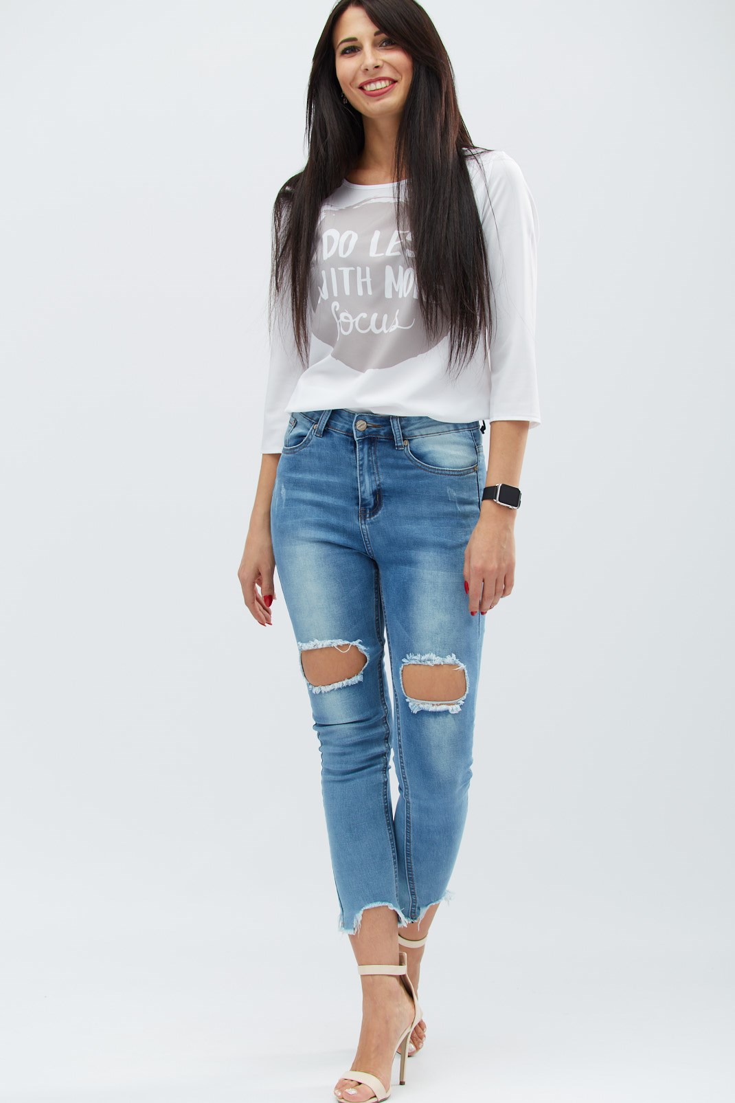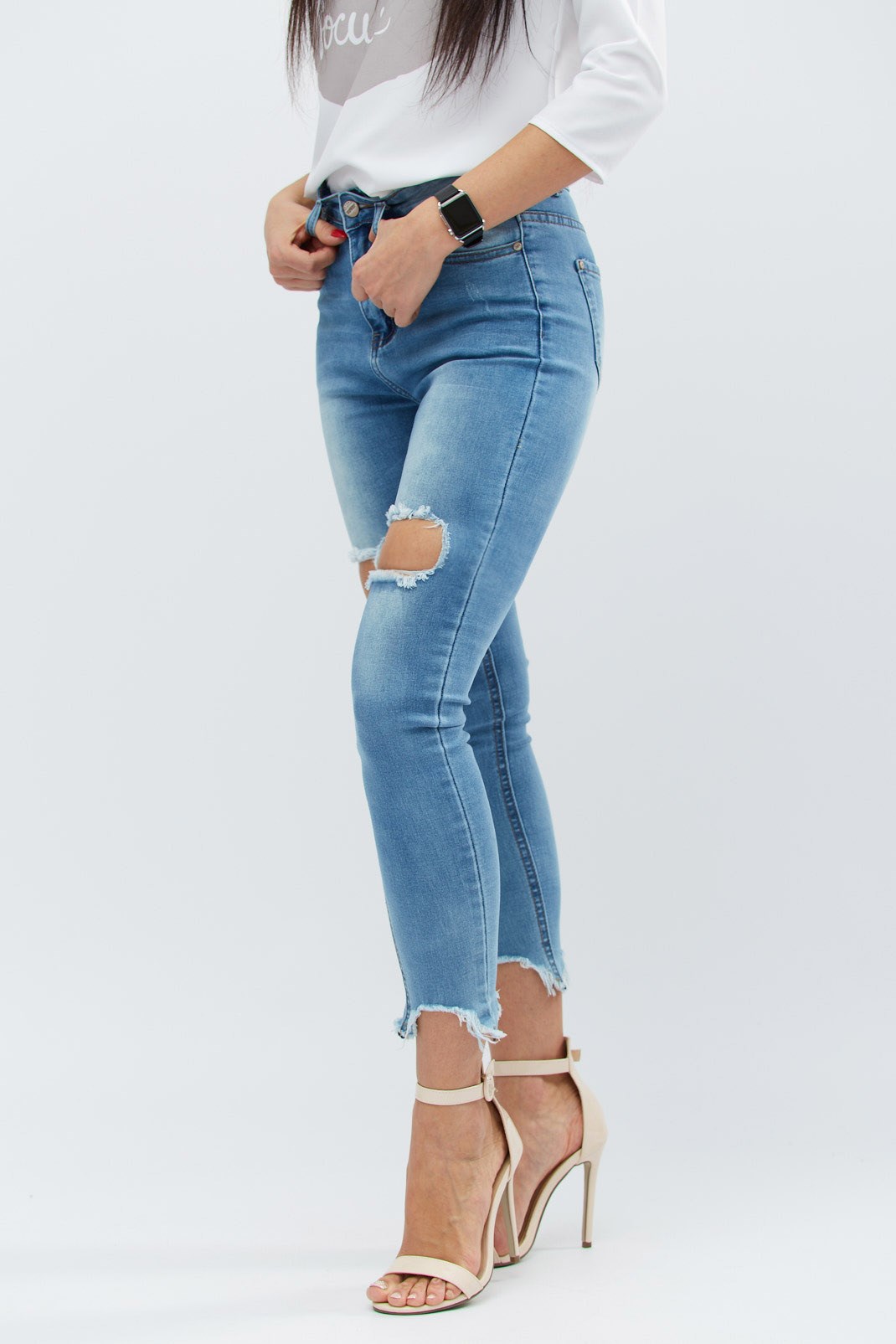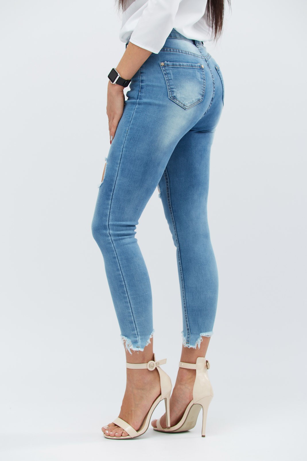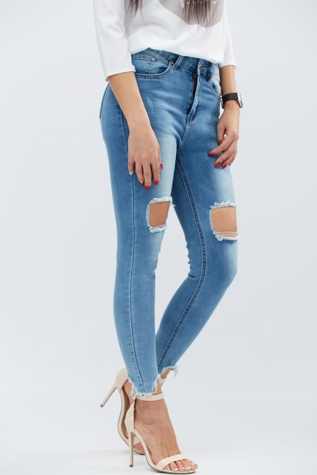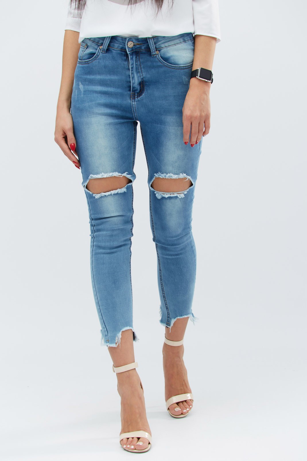 Женские скинни джинсы с высокой посадкой. Спереди застежка на пуговицу и молнию. Декоративны рваным низом и большими потертыми разрезами над коленями. Имеют передние и задние карманы.