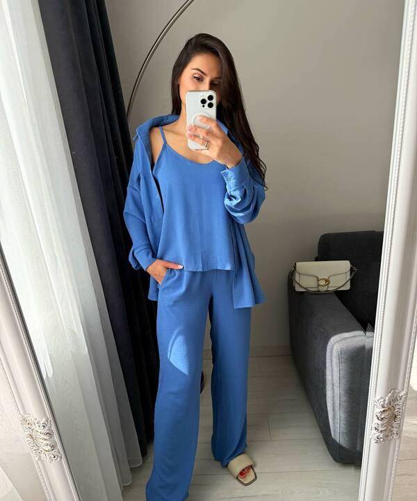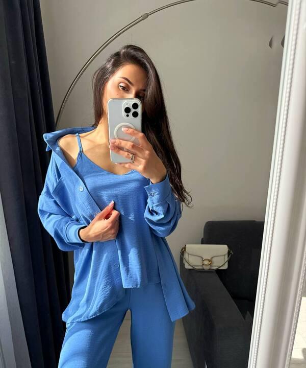 Главное преимущество этой модели — продуманный формат тройки. В комплект входят топ, свободная рубашка и брюки, благодаря чему образ получается более интересным, многослойным и завершенным. Такой набор особенно удобен тем, что его можно носить как полноценным комплектом, когда нужен цельный и эффектный образ, так и сочетать каждую вещь отдельно с другими элементами гардероба. Это делает костюм не только красивым, но и действительно практичным решением, которое дает сразу несколько вариантов стильных сочетаний.