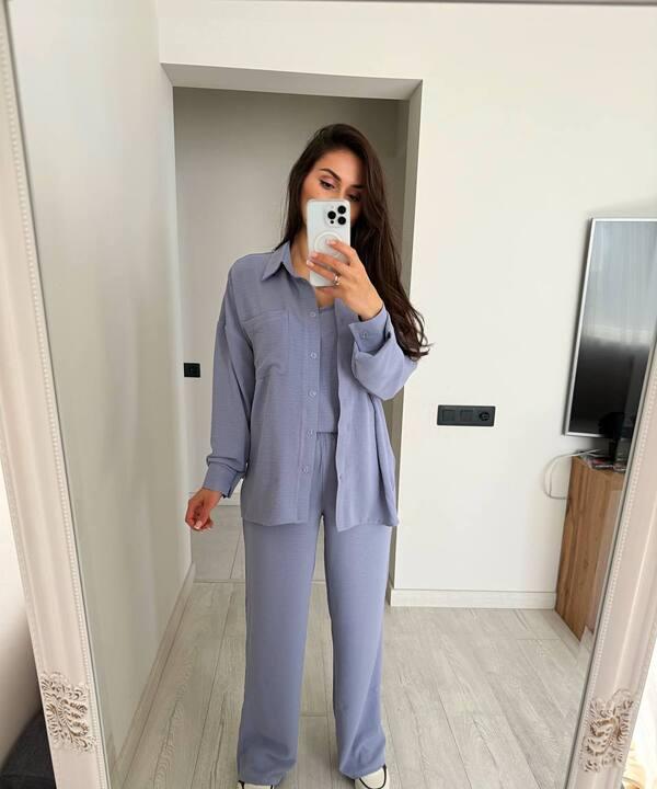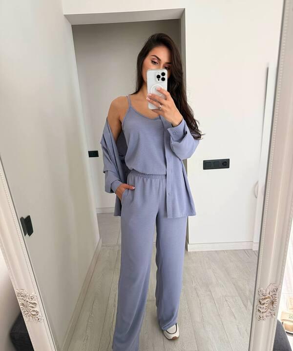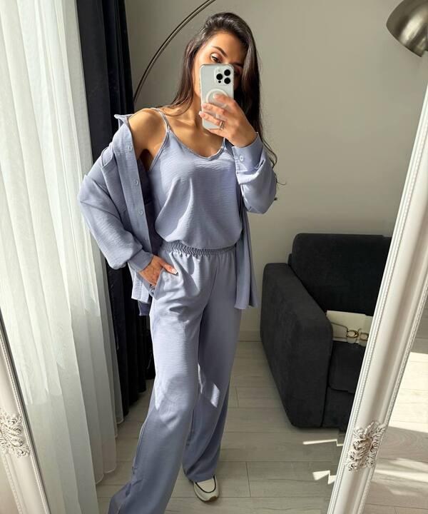 Главное преимущество этого костюма — его комплектность и универсальность. В образе гармонично сочетаются три элемента: легкий топ, свободная рубашка и брюки. За счет этого комплект выглядит более продуманно, многослойно и интересно. Его можно носить полностью, когда хочется получить завершенный стильный образ, а можно комбинировать каждую вещь отдельно с другими элементами гардероба. Это делает костюм особенно практичным и выгодным решением для сезона.