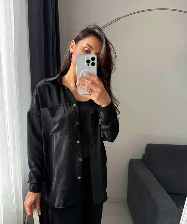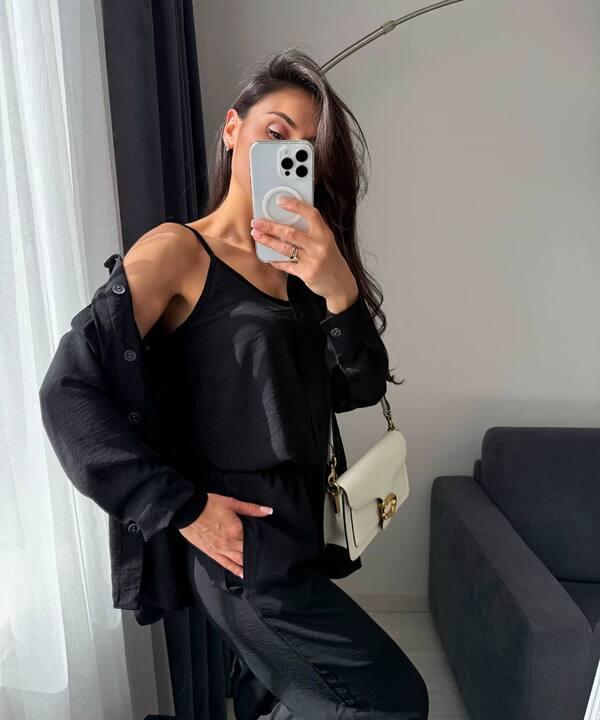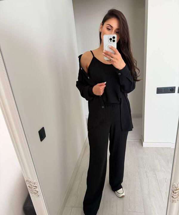 Главное преимущество этой модели — продуманный формат тройки. Комплект состоит из топа, свободной рубашки и брюк, благодаря чему образ выглядит более интересным, многослойным и завершенным. Такой набор особенно удобен тем, что его можно носить как полным комплектом, так и сочетать каждую вещь отдельно с другими элементами гардероба. Это делает костюм не только эффектным внешне, но и очень практичным, ведь один комплект дает сразу несколько вариантов стильных сочетаний для разных случаев.