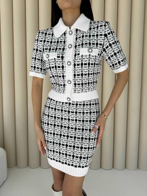 Костюм состоит из жакета с коротким рукавом и декоративными пуговицами и юбки мини длины, что подчёркивает фигуру и делает силуэт более изящным. Классический чёрно-белый узор в клетку добавляет образу французского шарма, а белый воротник и отделка создают акцент на деталях, усиливая утончённость наряда.