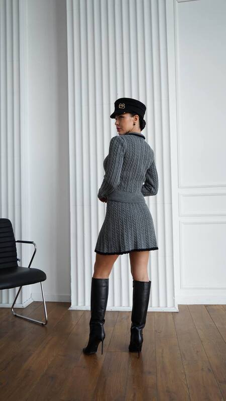 Кофта поло с длинным рукавом и застёжкой на пуговицы добавляет образу утончённости и делает его универсальным. Фактурная вязка украшает изделие и придает ему особый шарм. Юбка-солнце красиво ложится по талии и плавно расширяется книзу, формируя лёгкий и динамичный силуэт. Контрастная отделка по низу юбки добавляет выразительности и завершает дизайн комплекта. Такой костюм можно носить как самостоятельный ансамбль, создавая завершённый и модный образ без дополнительных акцентов.