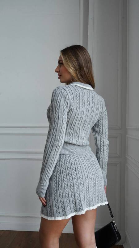 Кофта поло с длинными рукавами и фактурной вязкой подчеркивает фигуру и добавляет образу утончённости. Юбка-солнце мягко ложится по талии и создаёт лёгкий и женственный силуэт, придающий динамику и шарм. Контрастная отделка по низу юбки придаёт комплекту выразительности и свежести. Этот костюм прекрасно смотрится как с сапогами и ботильонами, так и с более лёгкой обувью, позволяя варьировать стиль в зависимости от случая.
