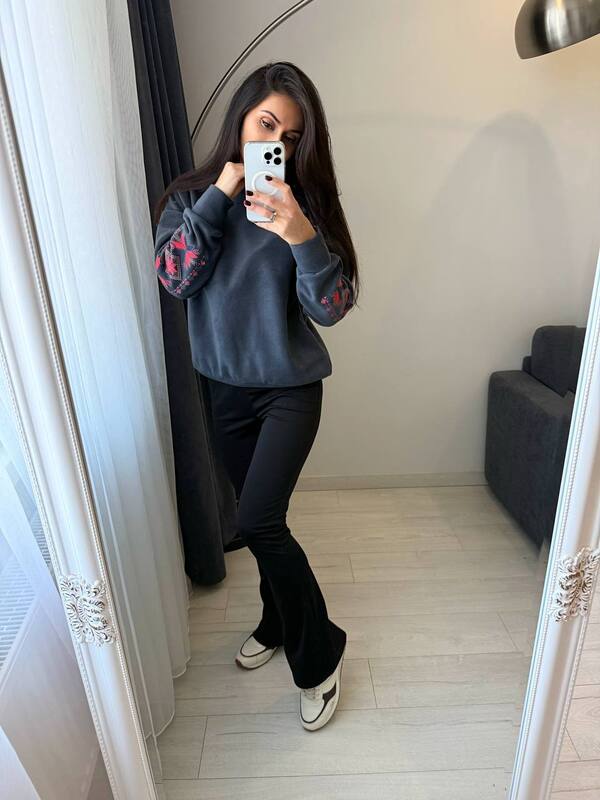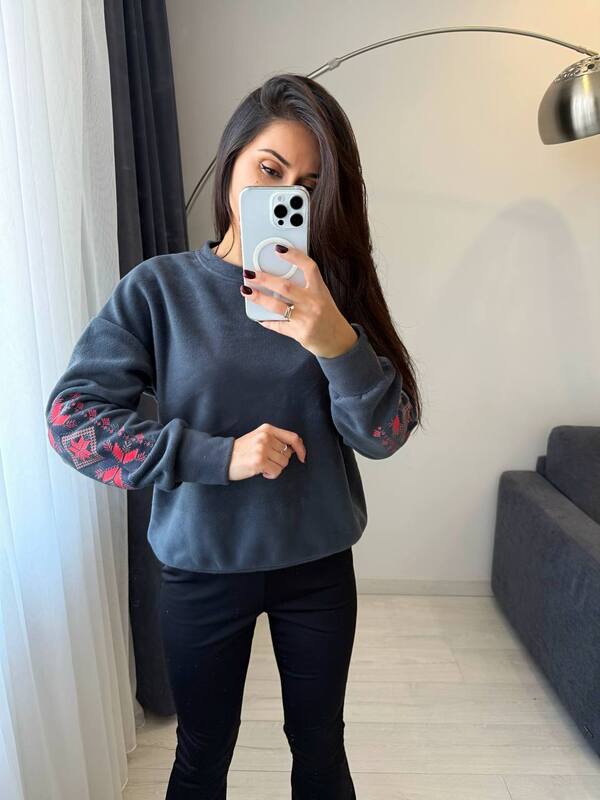 Кофта имеет прямой крой и украшена оригинальной вышивкой на рукавах, которая добавляет индивидуальности и делает образ выразительным. Материал — двусторонний флис, невероятно мягкий, приятный к телу и хорошо сохраняющий тепло. Эластичные манжеты и аккуратный круглый вырез обеспечивают удобную посадку и комфорт при носке.