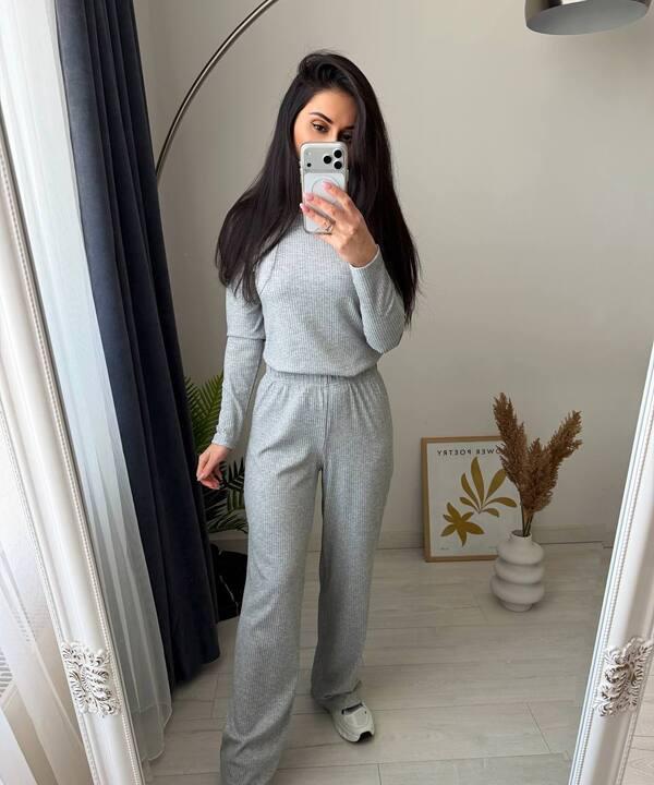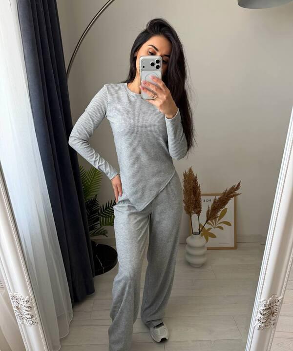 Ткань в рубчик придаёт изделию особую фактурность и делает образ более живым, объёмным и уютным. Материал приятно выглядит, хорошо тянется и комфортно ощущается в носке, поэтому костюм подходит для активного дня, прогулок, встреч, поездок и повседневного гардероба, когда хочется одновременно чувствовать удобство и выглядеть собранно. За счёт эластичности и мягкости ткань красиво садится по фигуре, подчёркивает силуэт, но не создаёт лишнего дискомфорта. Кофта с длинным рукавом делает комплект практичным для переменчивой погоды, а асимметричный низ добавляет фасону стильный современный характер.