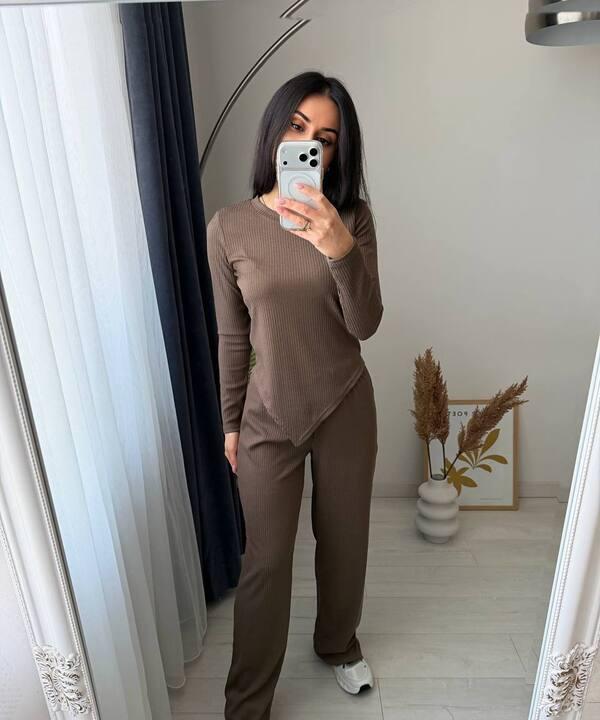 Ткань в рубчик придаёт изделию красивую фактуру и делает образ более объёмным и живым. Материал приятно прилегает к телу, хорошо тянется и обеспечивает комфорт в течение всего дня, поэтому костюм отлично подходит для активного ритма, прогулок, встреч, поездок и повседневных дел. За счёт мягкости и эластичности ткань красиво садится по фигуре, подчёркивает силуэт, но не сковывает движения. Длинный рукав делает верх практичным для прохладной погоды, а асимметричная линия низа добавляет модели модный акцент и современный характер.