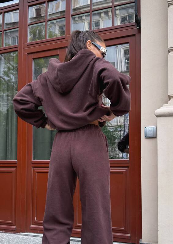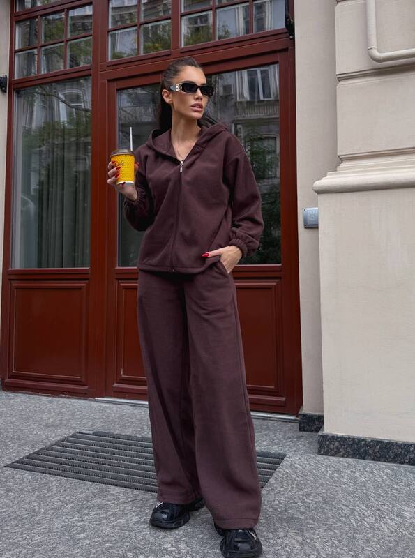 Модель выполнена в формате двойки: кофта на молнии и брюки с высокой посадкой. Верх имеет свободный крой с эластичными манжетами и воротником-стойкой, что добавляет удобства и создаёт современный спортивный силуэт. Брюки прямые, слегка зауженные к низу, на мягкой резинке, обеспечивающей комфорт и свободу движений. Благодаря лаконичному дизайну и качественному пошиву костюм выглядит стильно и универсально — его можно носить не только в спортивном, но и в повседневном стиле.