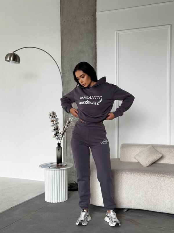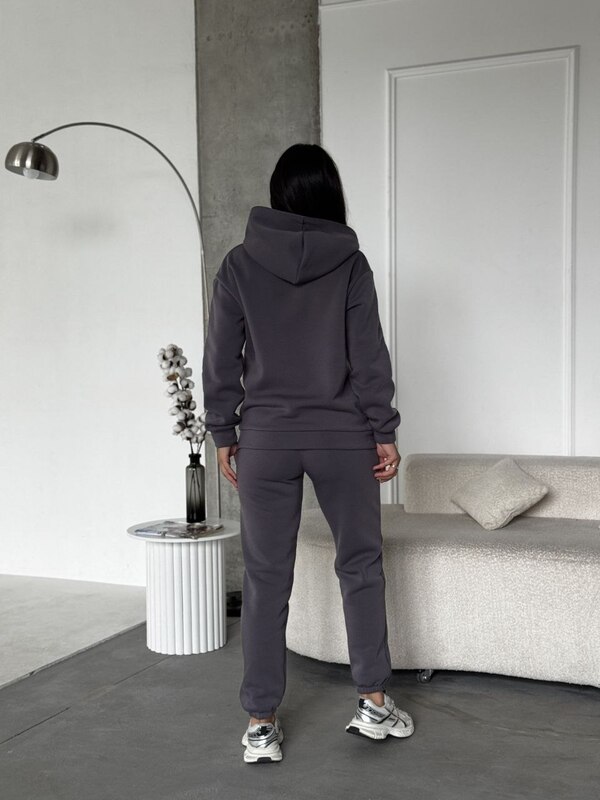 Штаны-джоггеры с эластичной талией и манжетами по низу идеально садятся по фигуре и не стесняют движений. Высокая посадка визуально удлиняет ноги и делает силуэт стройнее. На боках расположены два удобных кармана, добавляющих практичности и завершённости образу. Мягкий внутренний слой с начёсом делает костюм особенно уютным, сохраняя тепло даже в прохладные дни.