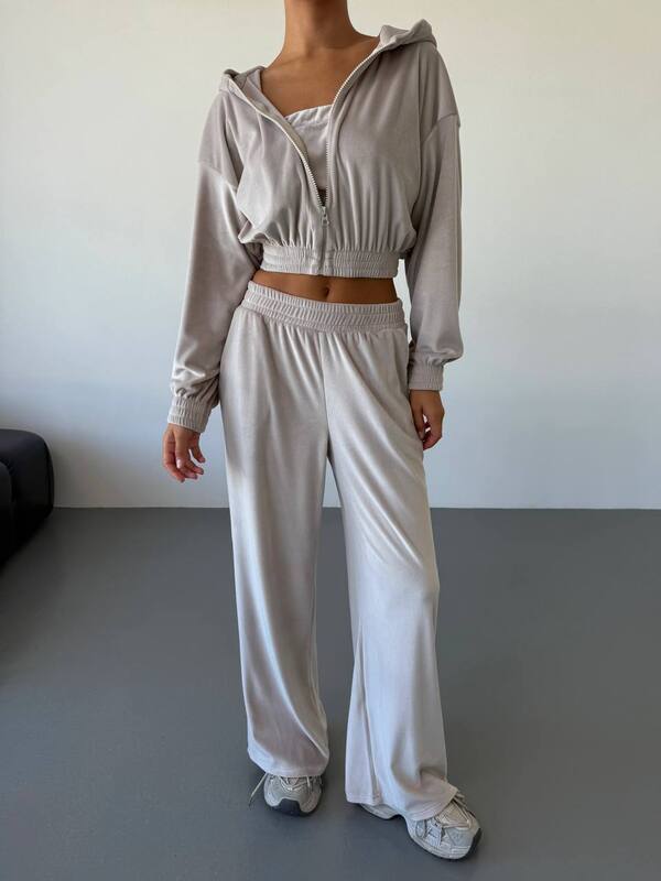 Брюки длиной по внешнему шву 103–105 см создают элегантный силуэт и визуально удлиняют ноги. Укороченная кофта длиной 48–50 см подчёркивает фигуру и идеально дополняет топ. Эластичный пояс и мягкий велюр гарантируют удобство в движении и комфорт на протяжении всего дня. Костюм выглядит дорого и современно, сохраняя баланс между практичностью и стильностью.
