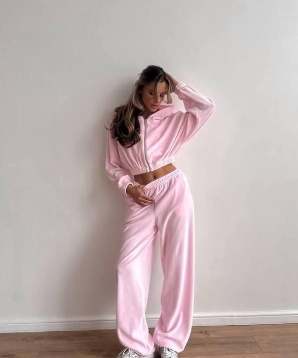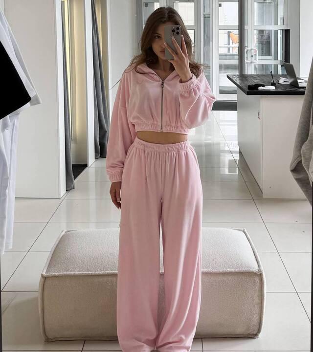Отдельного внимания заслуживает велюр. Ткань мягкая, приятная к телу, нежная на ощупь и очень уютная в носке. Она красиво смотрится, делает комплект более дорогим и привлекательным визуально, а также добавляет образу мягкость и глубину. Такой костюм приятно носить в течение дня, он дарит комфорт и помогает чувствовать себя максимально расслабленно. Это удачный выбор для женщин, которые любят современные спортивные костюмы с модной посадкой, приятной тканью и красивой подачей. Комплект легко сочетается с кроссовками, кедами и другой повседневной обувью, поэтому быстро станет одной из самых любимых вещей в гардеробе.