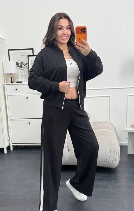 Брюки в этом костюме выполнены в широком свободном крое, поэтому красиво ниспадают по фигуре и создают ощущение лёгкости в движении. Контрастные лампасы по бокам становятся выразительной деталью и визуально вытягивают силуэт, благодаря чему ноги кажутся длиннее, а образ — более стройным и эффектным. Такой фасон особенно удачен для тех, кто любит сочетание удобства и модного внешнего вида. Брюки не сковывают движения, хорошо подходят для активной повседневной носки и смотрятся актуально с удобной обувью на каждый день.