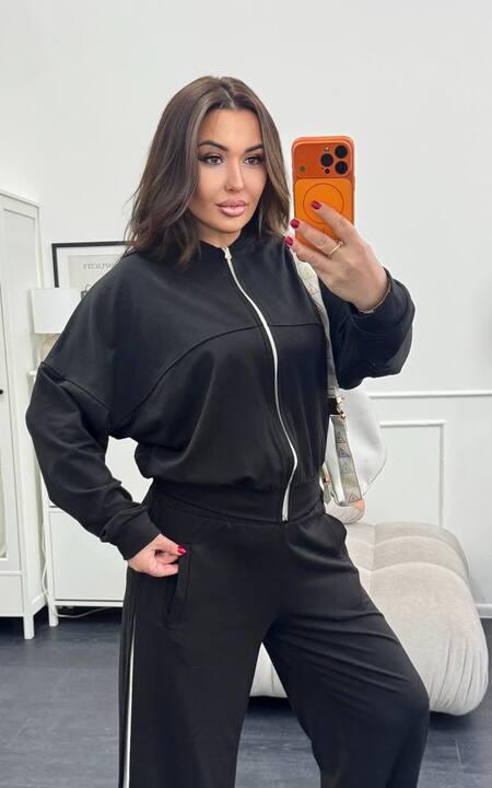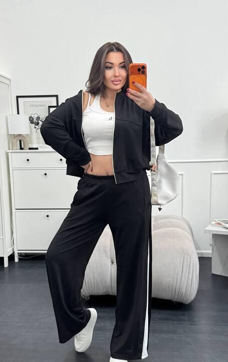 Верх выполнен в формате укороченной кофты на молнии, что делает модель особенно трендовой и визуально лёгкой. Кофта красиво сочетается с широкими брюками, создавая гармоничный и современный силуэт. Молния добавляет практичности и позволяет менять подачу образа: верх можно носить полностью застёгнутым или слегка расстёгнутым. Длинный рукав и удобный крой делают кофту комфортной для повседневной носки, а аккуратная посадка помогает комплекту выглядеть ещё более стильно и современно.