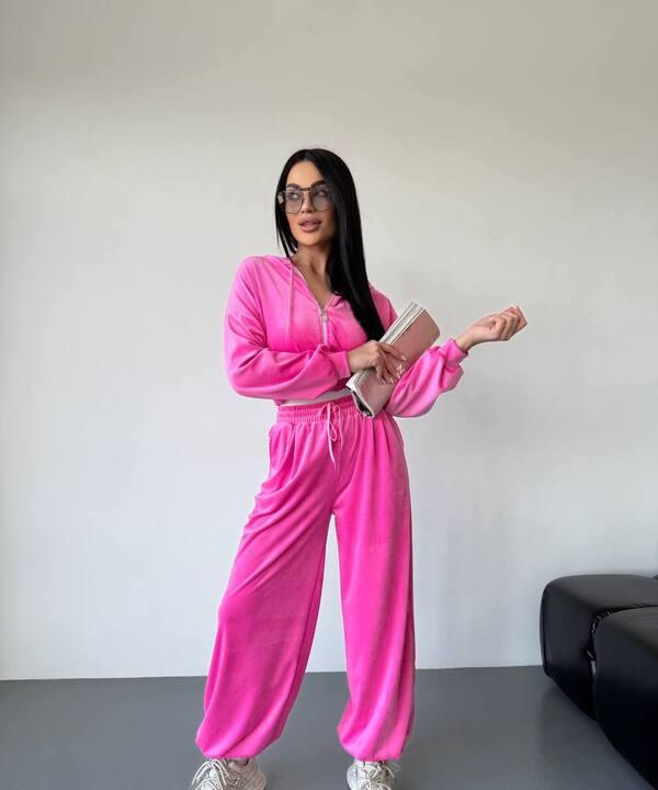 Мягкий велюр приятно ощущается к телу и создает особое чувство уюта с первых минут носки. Материал выглядит красиво и выразительно, делает образ более дорогим и ухоженным, при этом остается практичным и удобным. За счет своей фактуры ткань добавляет комплекту выразительности, а сама модель смотрится женственно и современно. Это именно тот вариант одежды, который хочется носить часто благодаря приятным ощущениям и удобной посадке.